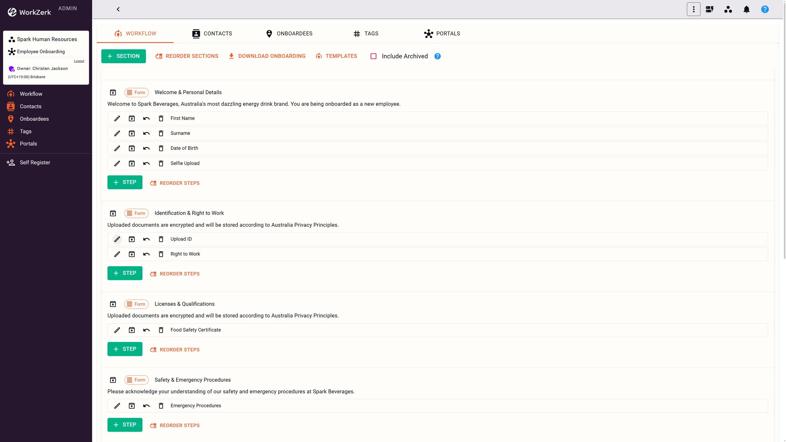 It’s super simple for onboardees, with no login, password or download required. People just follow their personalised portal link emailed from the Admin area.