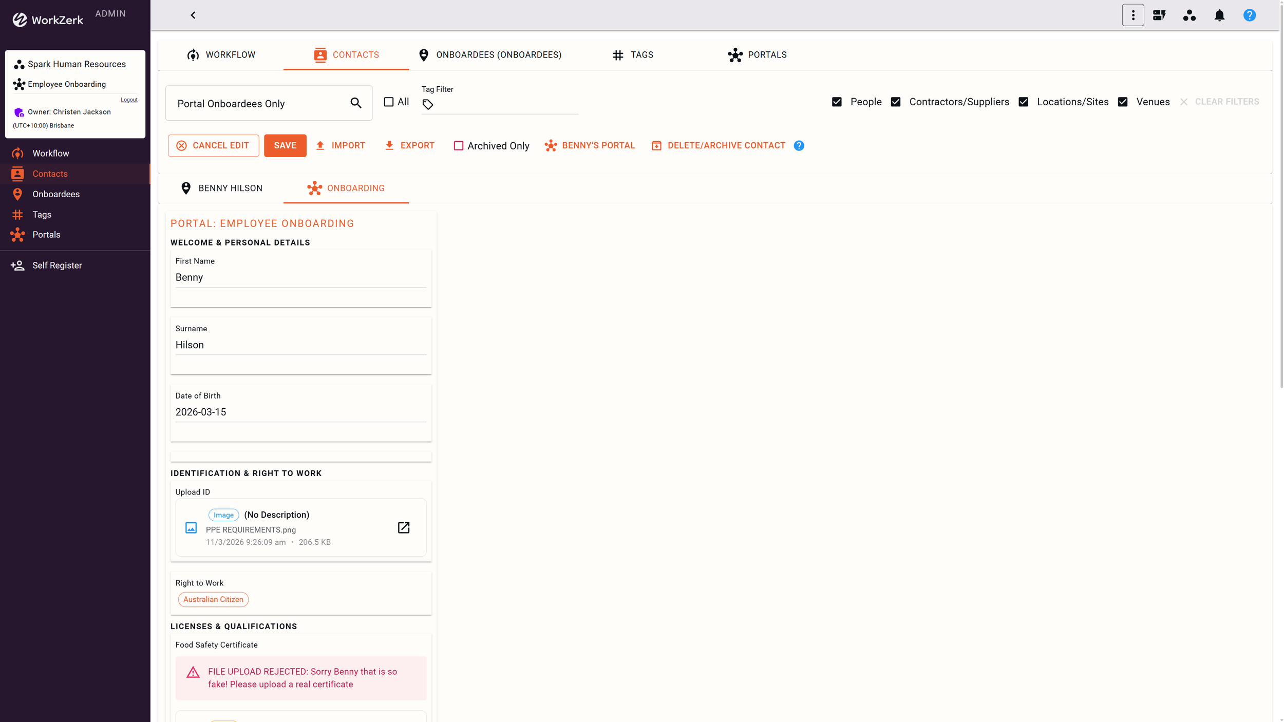 Whether it's construction sites requiring White Cards and high-risk work licenses, or facilities needing public liability insurance and working with children checks — WorkZerk adapts to your workflows.