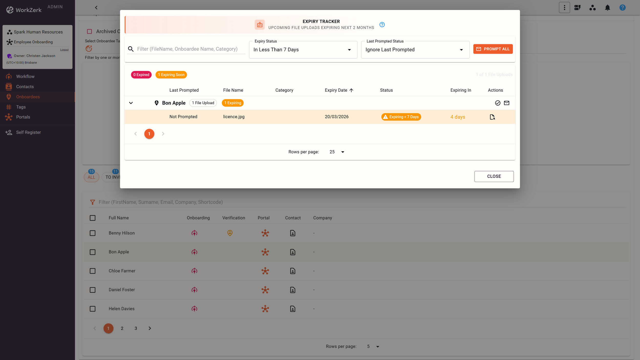You can also prompt for an ‘Expiry Date’ to be entered for each upload which can then be tracked in WorkZerk and reminders sent to reupload current documents.