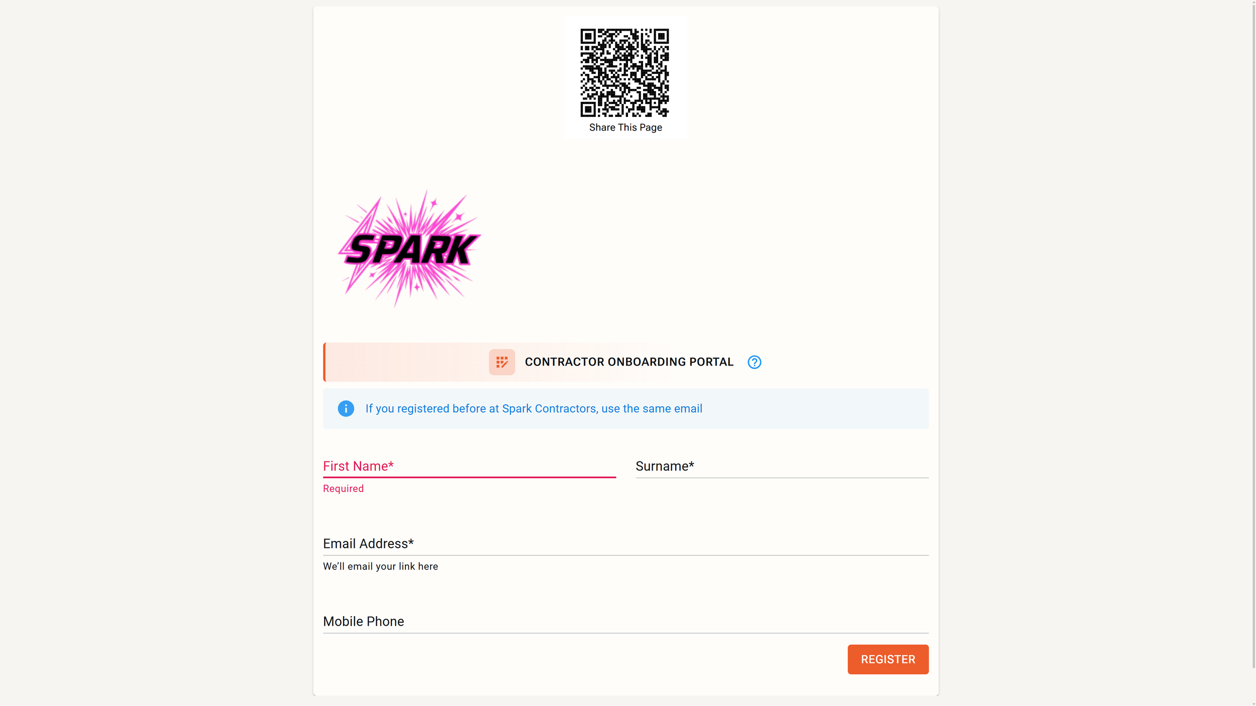 Let visitors or contractors register themselves on their own devices. Share a link or QR code, they enter their details and instantly receive a private onboarding portal.